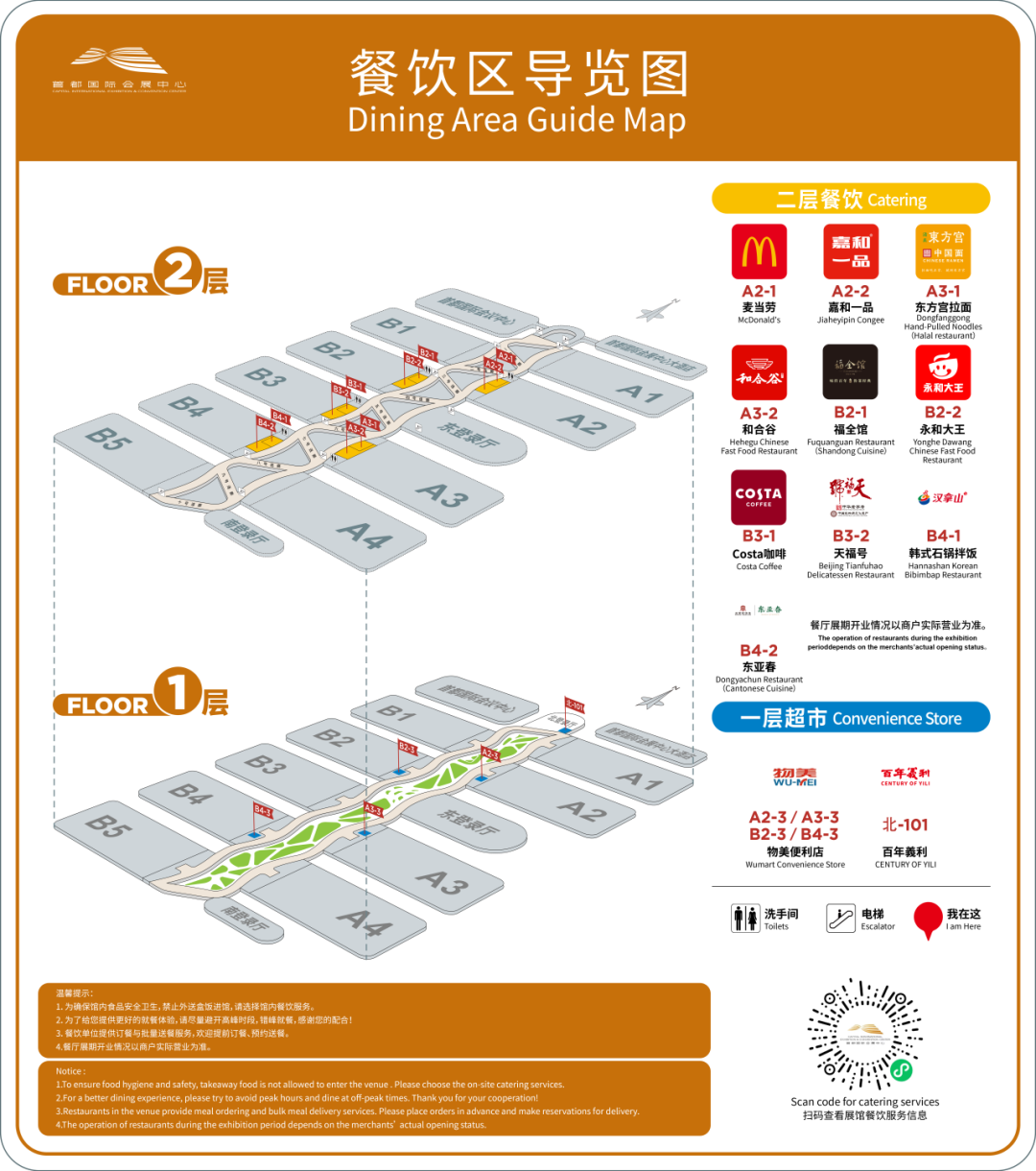 首都国际会展中心内部设有固定商铺及临时盒饭售卖点,涵盖中西式快餐、地方风味、咖啡简餐及便利店等多种类型,可满足不同人群的多元用餐需求。二层连廊处设置了宽敞的集中用餐区,通透的玻璃幕墙设计,让观众可在此一边用餐一边沐浴阳光,俯瞰中央庭院的景观,在忙碌的逛展之余享受片刻放松与惬意。